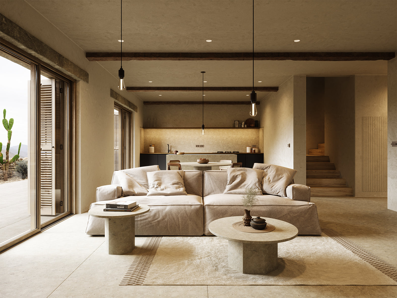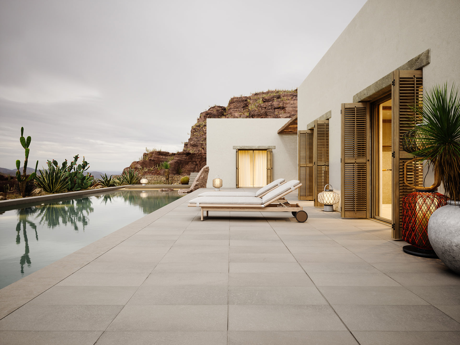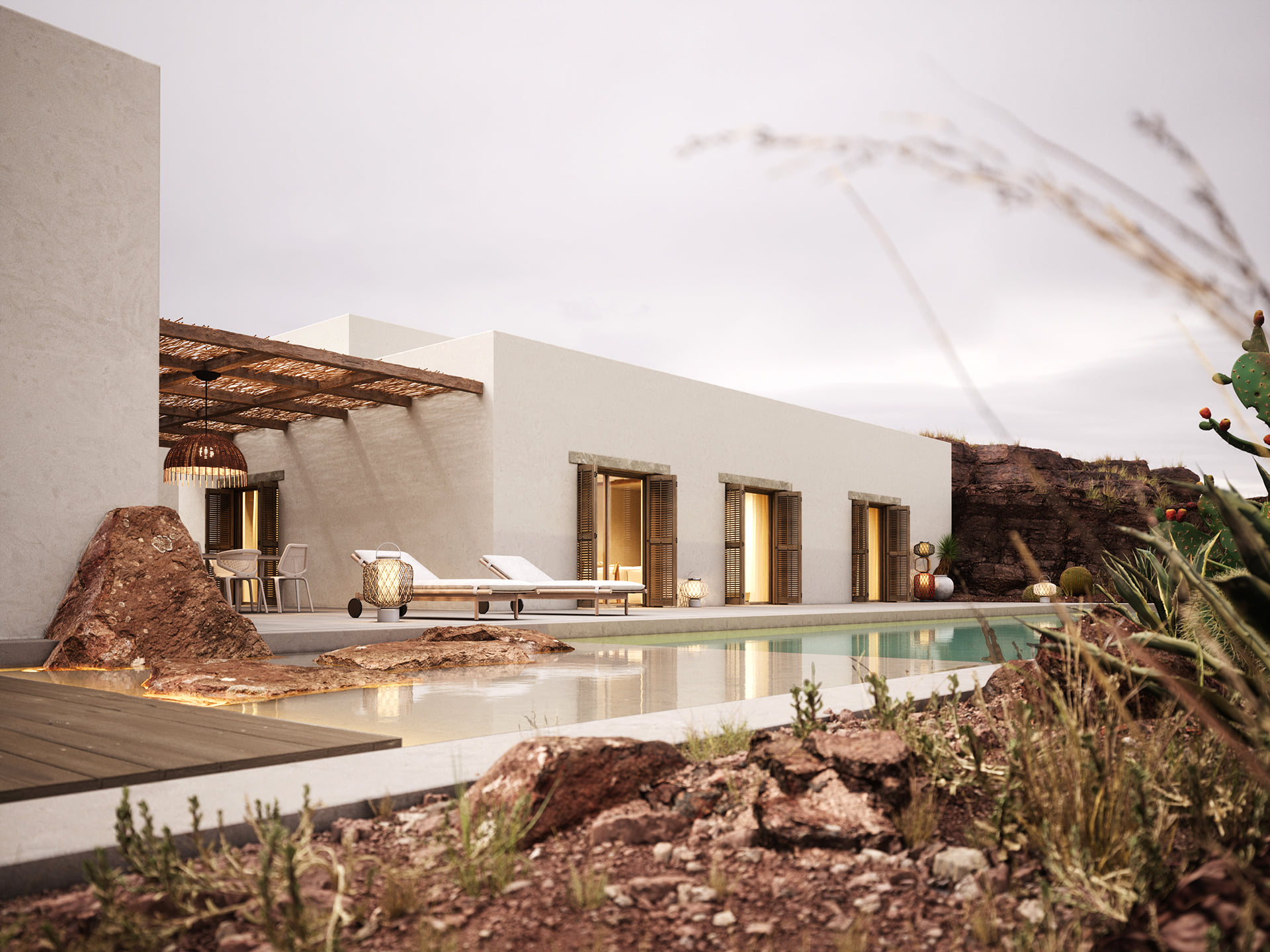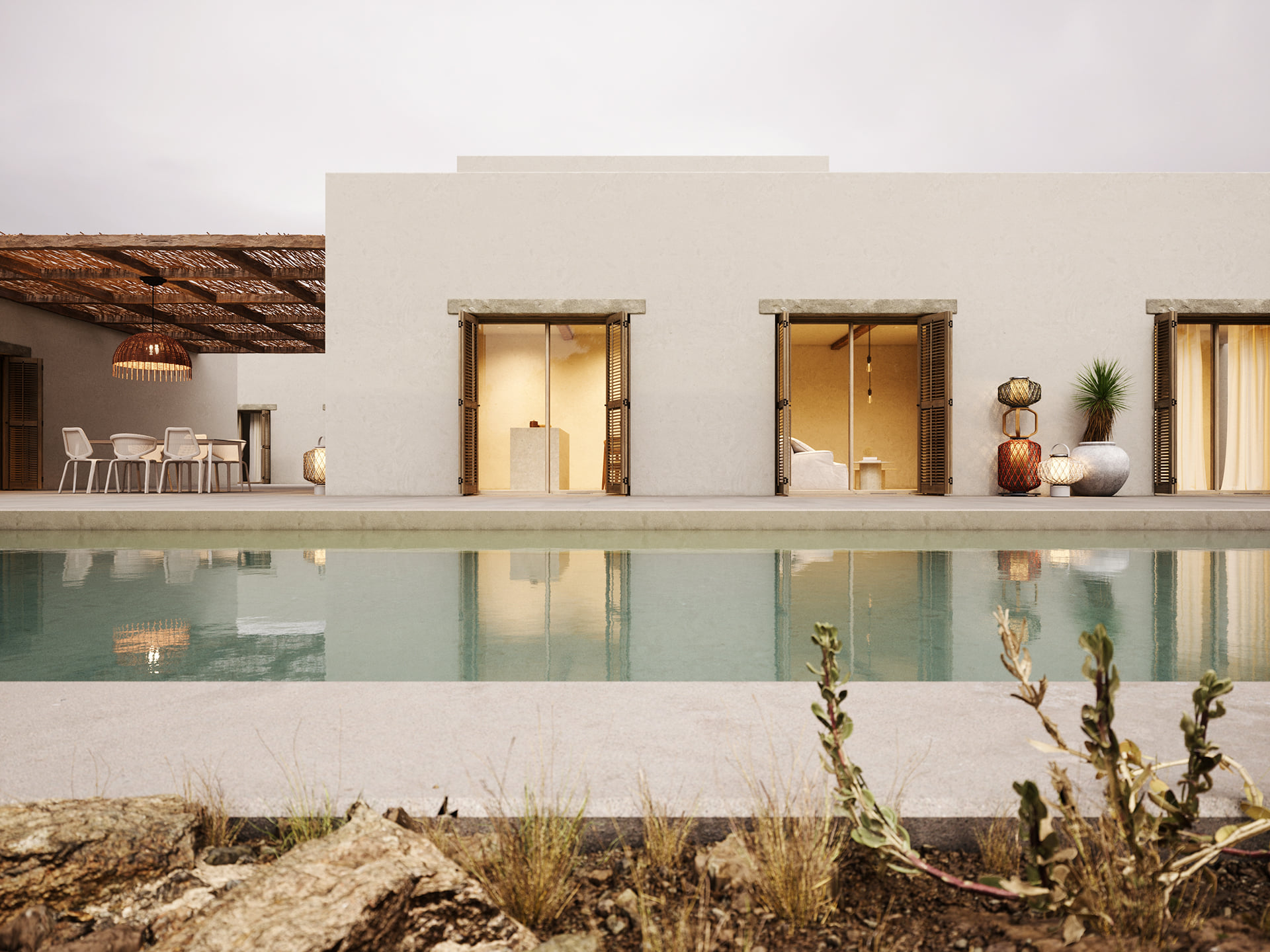 Emerging from the golden sands, this square-shaped desert retreat is a masterpiece of modern design and natural harmony. The pristine white facade reflects the sunlight, creating a striking contrast against the rugged desert landscape. Inside, the building is a haven of tranquility. Microcement floors and wood accents bring warmth and texture to the minimalist interior, while a central pool adds a refreshing touch of luxury. The pool’s still waters mirror the vast desert sky, blurring the line between indoors and out. Every detail of this retreat is designed to celebrate its surroundings. The clean lines and simple geometry of the structure pay homage to traditional desert architecture, while the use of modern materials ensures comfort and durability. This is more than a building—it’s a sanctuary where the timeless beauty of the desert meets contemporary elegance.