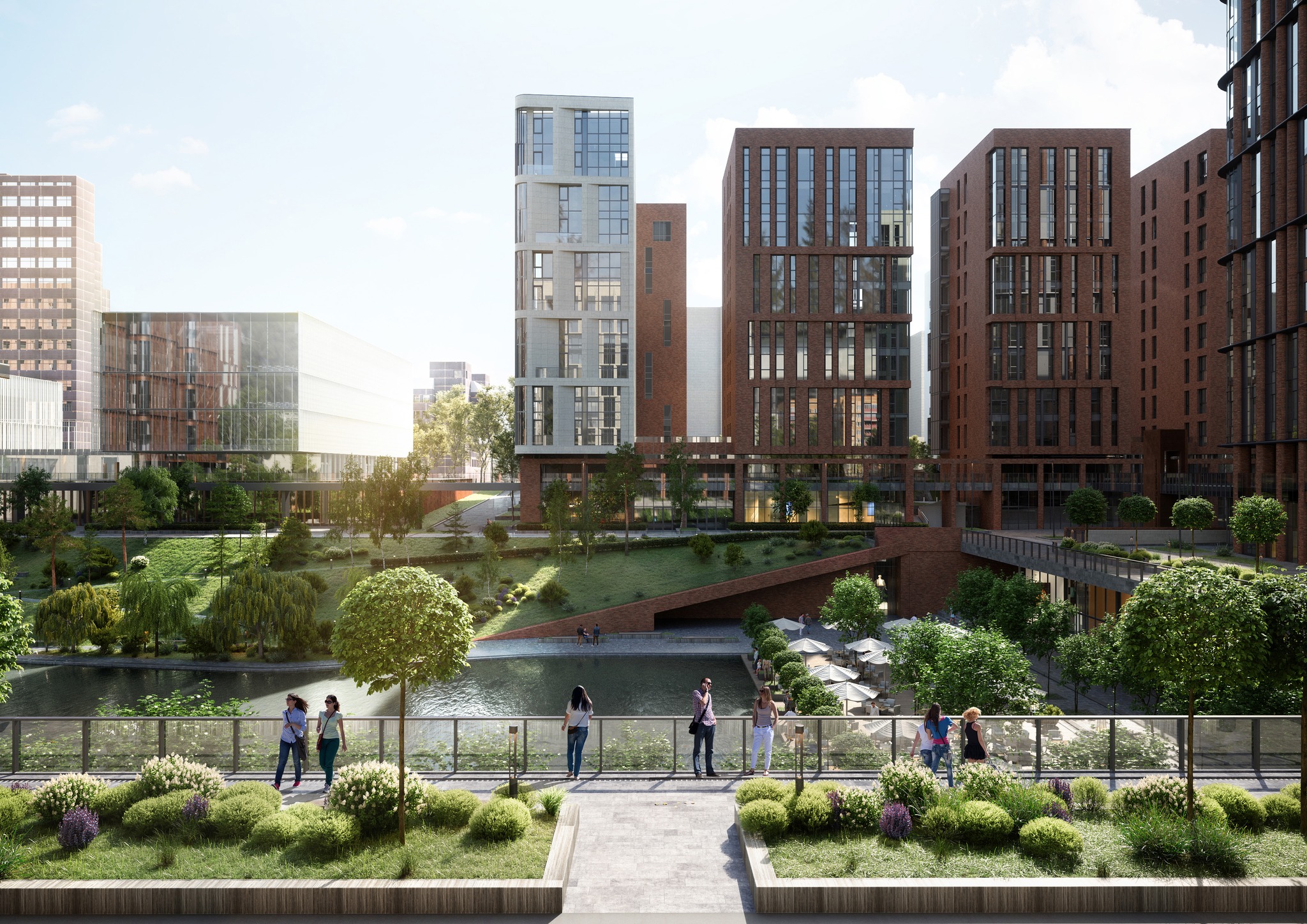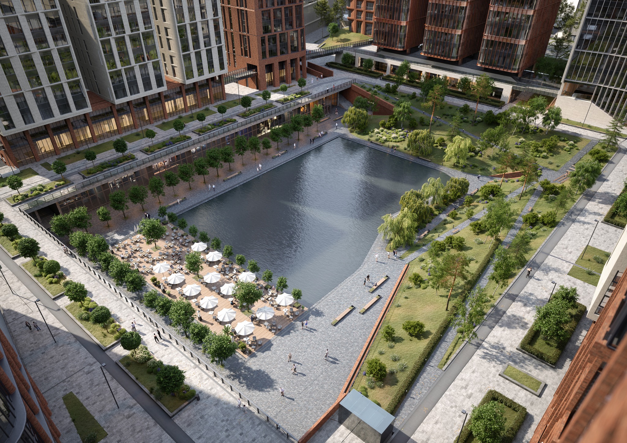This project features a cluster of modern residential buildings strategically arranged around its centerpiece: a multifunctional artificial lake. Designed to provide year-round functionality, the lake transforms into a skating rink during the winter months, while in the summer, it becomes a hub for relaxation with sunbeds and swimming areas. The buildings boast a striking dark red brick and white façade, combining timeless materials with contemporary architectural design. Expansive windows flood the interiors with natural light, creating airy and comfortable living spaces. The surrounding landscape features generous green areas, enhancing the project’s sense of harmony and community while offering ample recreational opportunities for residents. This development showcases a perfect balance between modern aesthetics, functionality, and a strong connection to nature, making it an inviting and vibrant place to live.