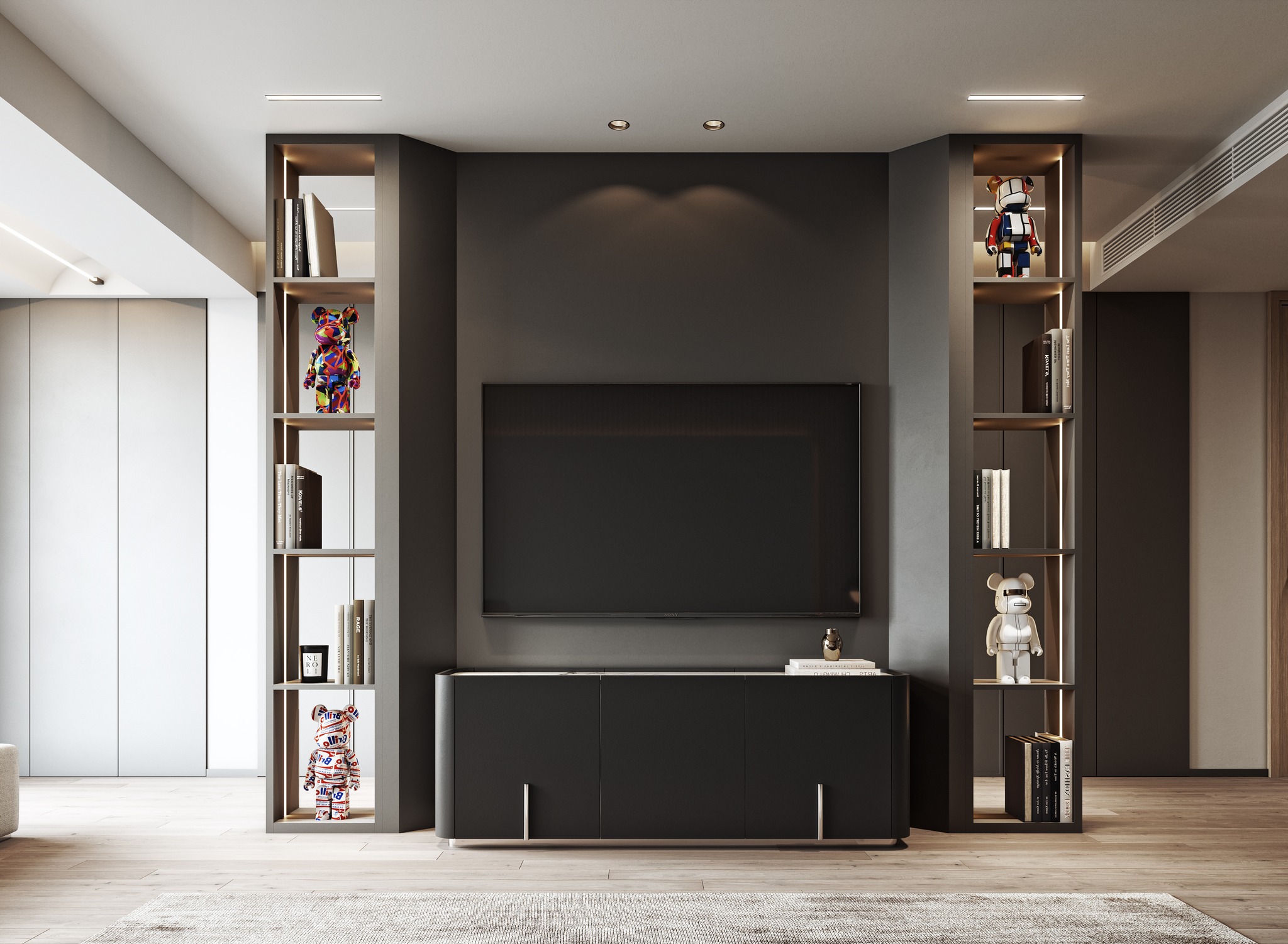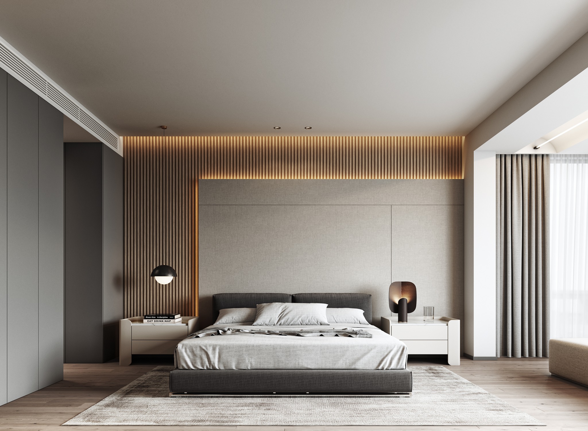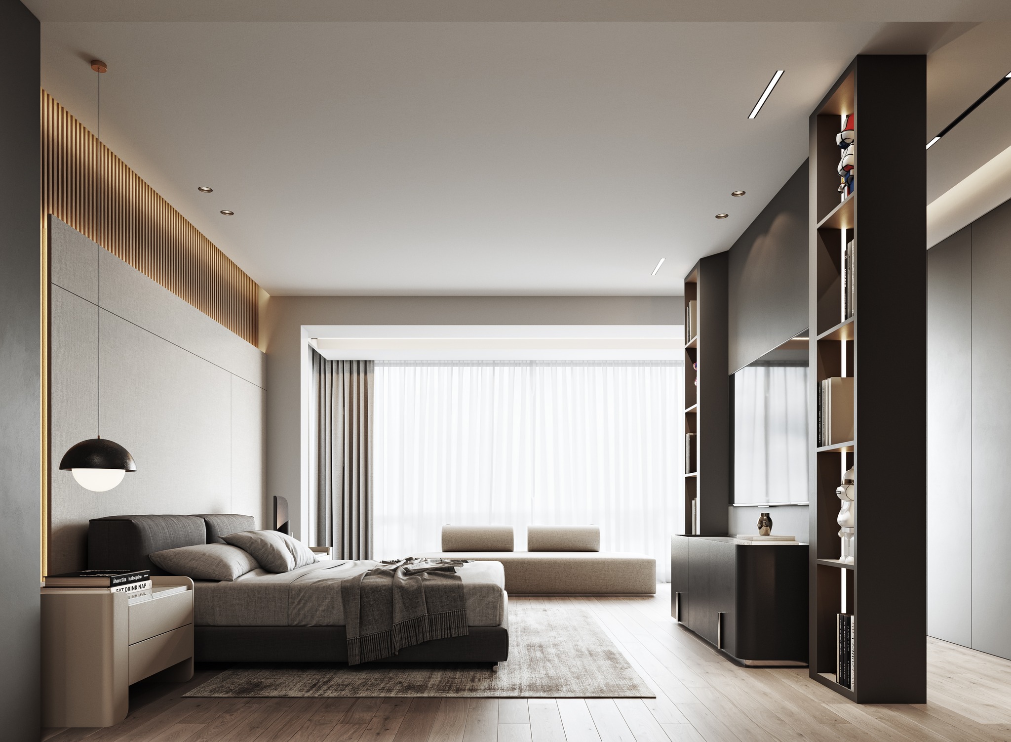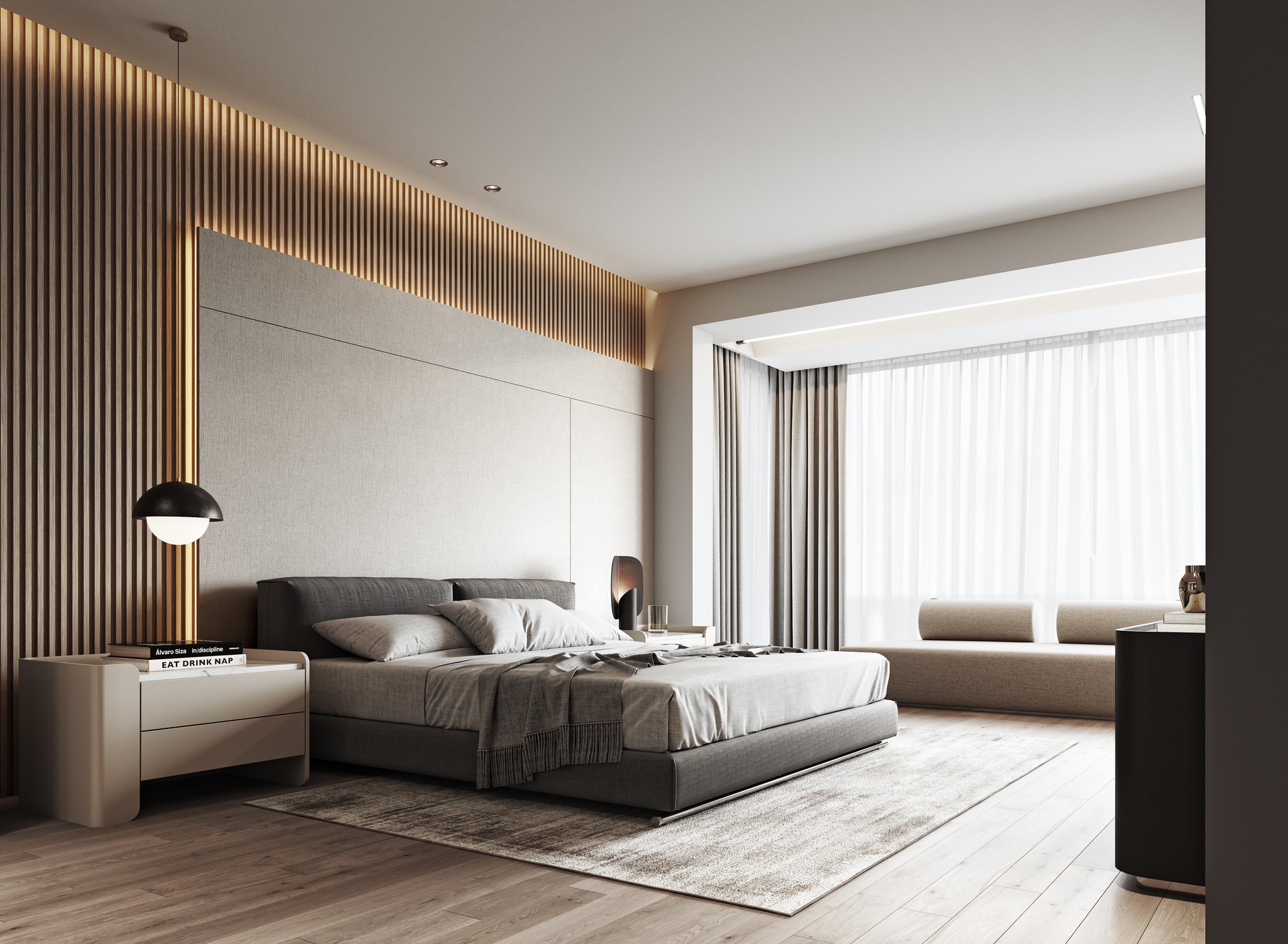 This bedroom design epitomizes luxurious minimalism, blending modern sophistication with warm, natural elements. Wooden stripes on the walls and ceiling create a rhythmic, textured backdrop, while soft textiles in the bedding and upholstery add layers of comfort and elegance. The space is bathed in an abundance of natural light, complemented by carefully curated artificial lighting that enhances the room’s ambiance. Recessed lights, pendant fixtures, and subtle LED strips work in harmony to create a balanced and inviting atmosphere. Every detail, from the clean lines to the carefully chosen materials, reflects a commitment to understated luxury, resulting in a bedroom that is both serene and visually captivating.