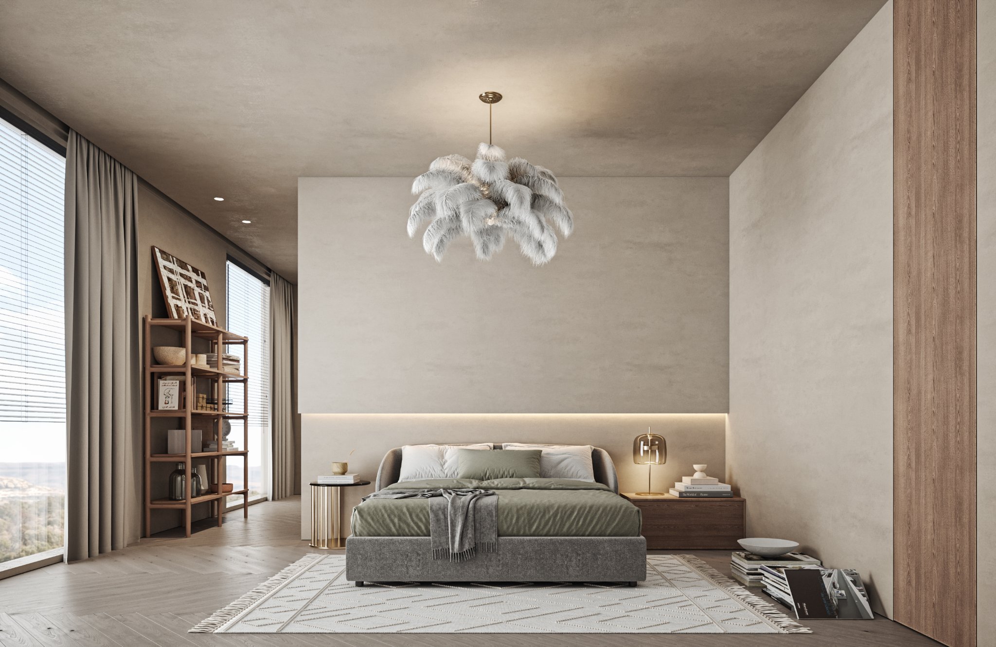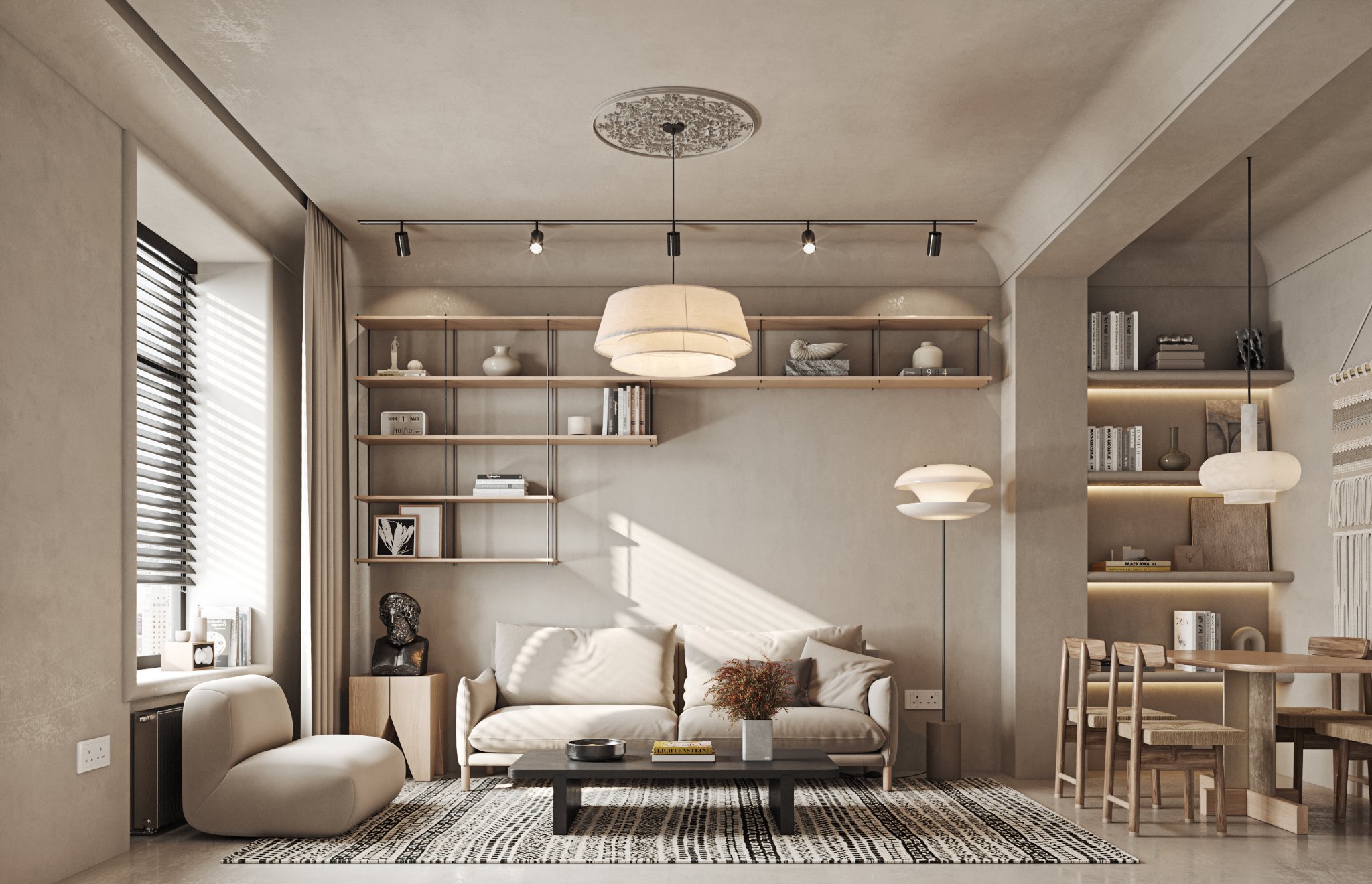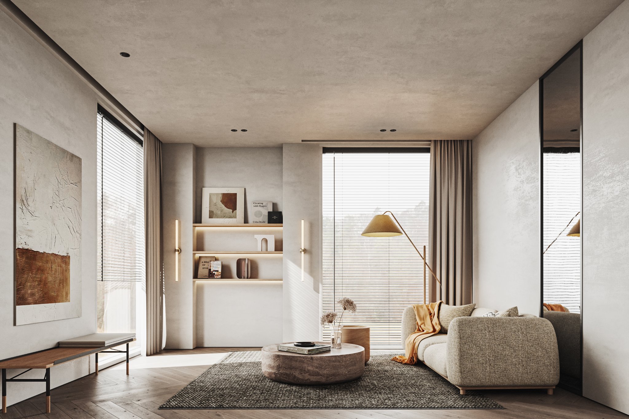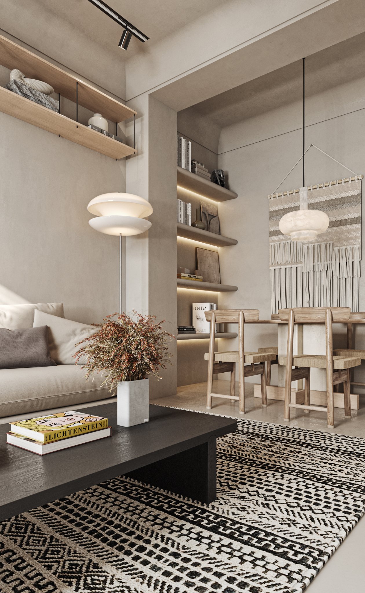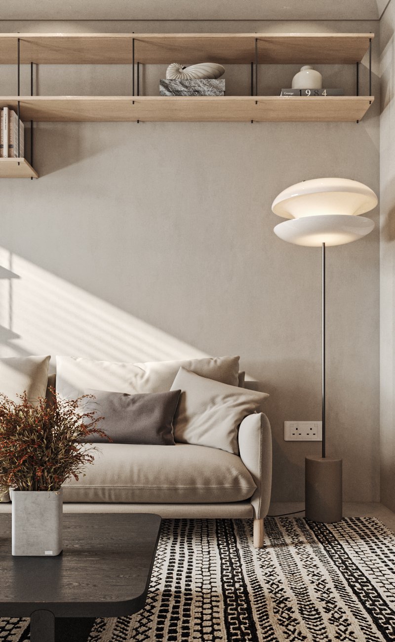 This interior design celebrates the beauty of minimalism, featuring microcement walls that provide a sleek, textured backdrop for the space. The clean, monochromatic palette of white and warm tones creates a serene and inviting atmosphere, while carefully chosen accents add depth and character. The ceiling becomes a focal point with its unique, sculptural lighting fixtures, which cast a soft, ambient glow and enhance the room’s modern aesthetic. Every element, from the streamlined furniture to the subtle textures, is thoughtfully curated to balance functionality and elegance. This space is a testament to the power of simplicity, where light, texture, and warmth come together to create a harmonious and sophisticated environment.