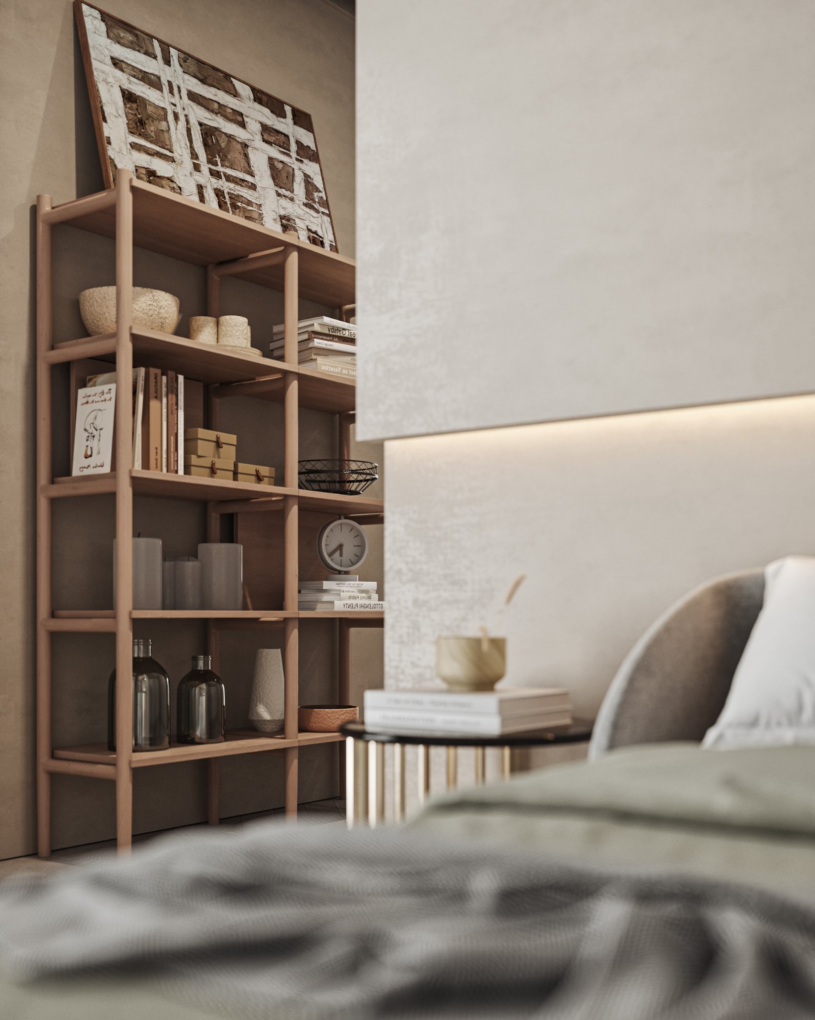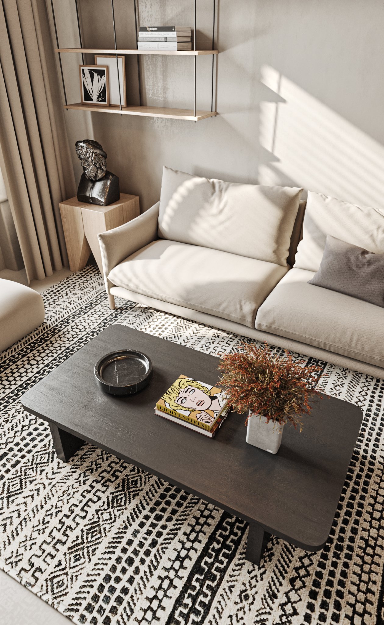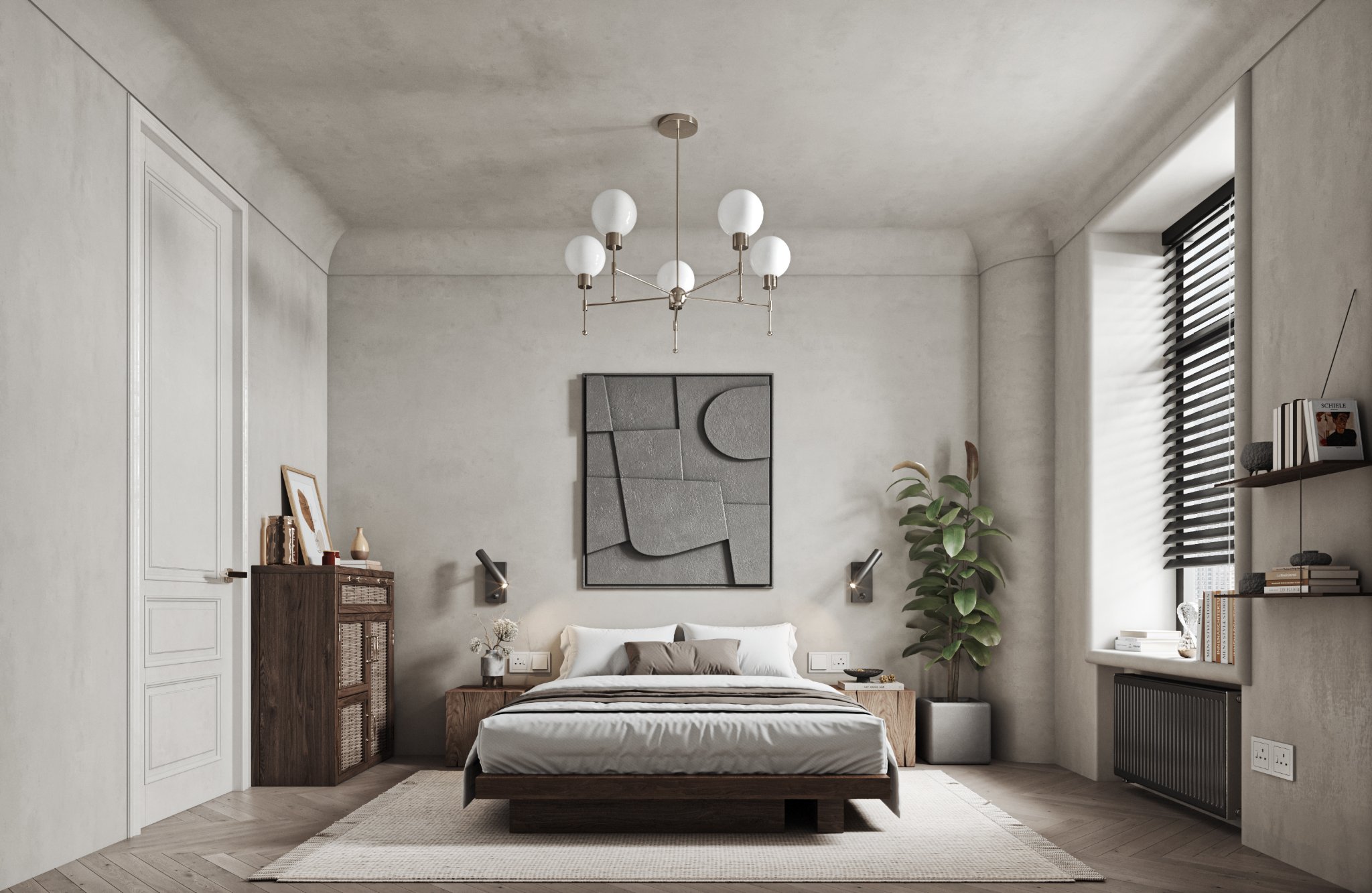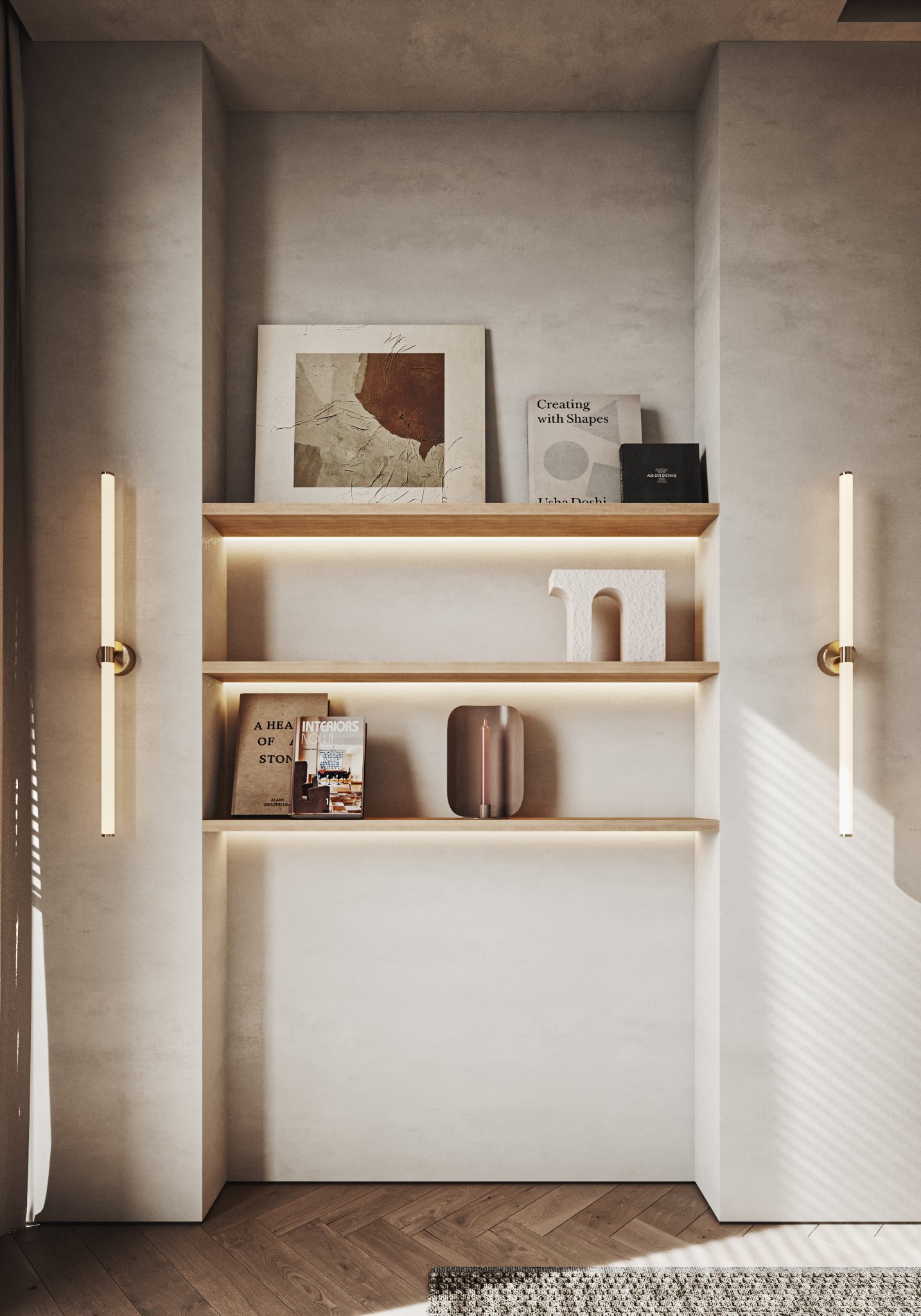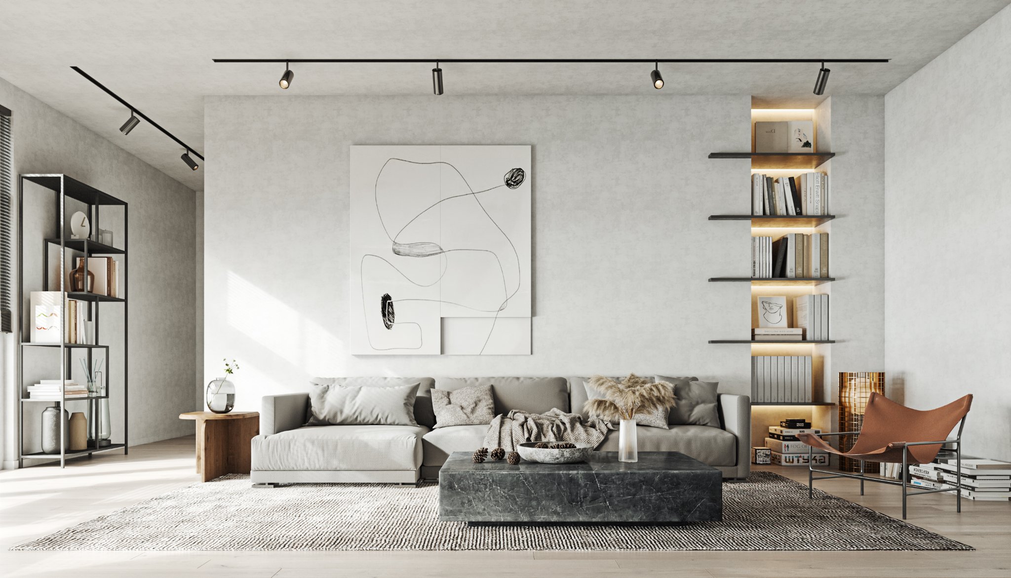 This interior design celebrates the beauty of minimalism, featuring microcement walls that provide a sleek, textured backdrop for the space. The clean, monochromatic palette of white and warm tones creates a serene and inviting atmosphere, while carefully chosen accents add depth and character. The ceiling becomes a focal point with its unique, sculptural lighting fixtures, which cast a soft, ambient glow and enhance the room’s modern aesthetic. Every element, from the streamlined furniture to the subtle textures, is thoughtfully curated to balance functionality and elegance. This space is a testament to the power of simplicity, where light, texture, and warmth come together to create a harmonious and sophisticated environment.