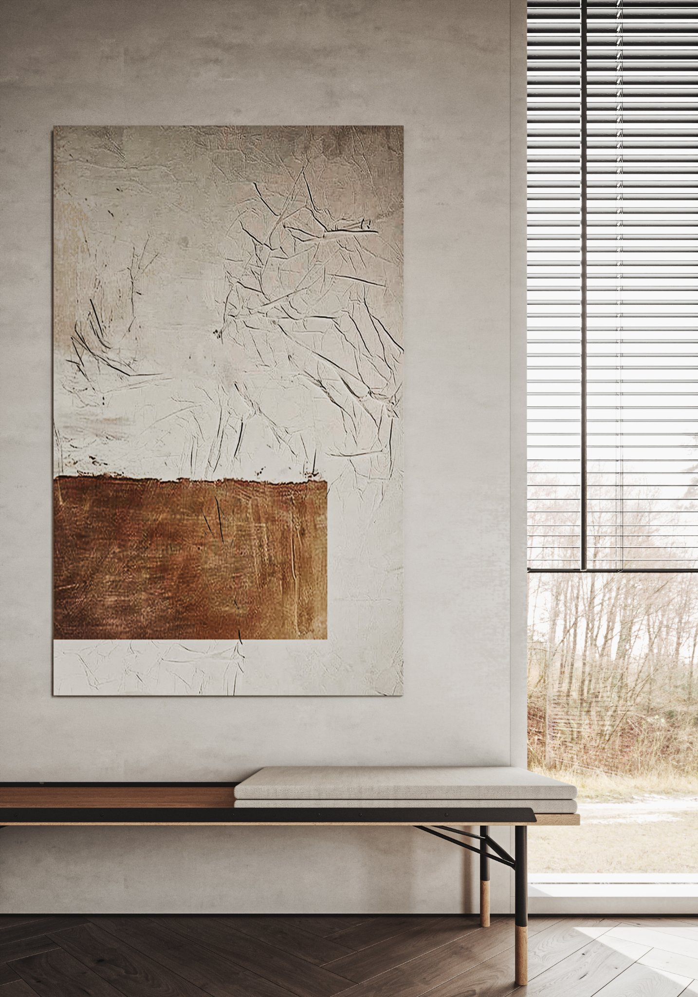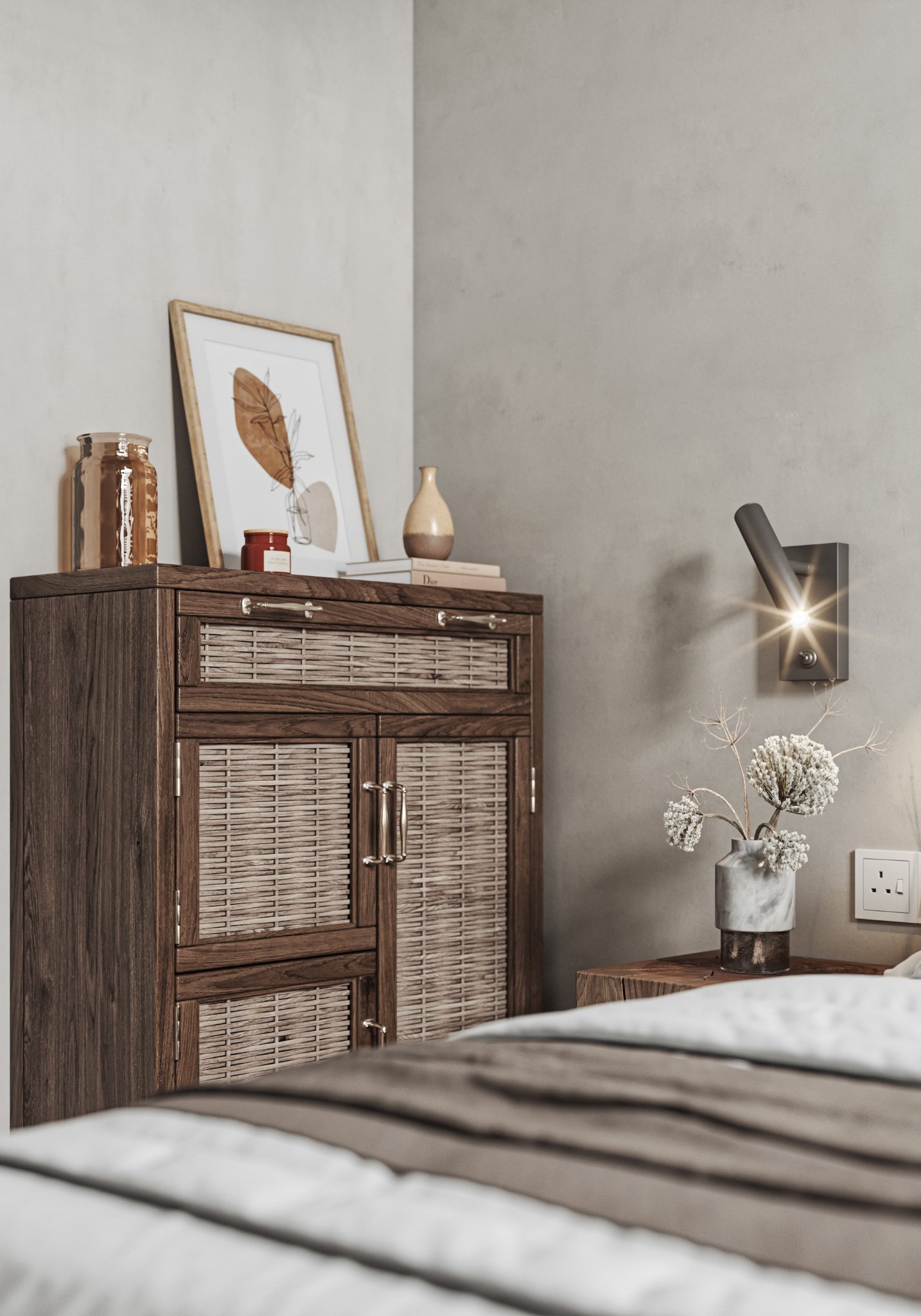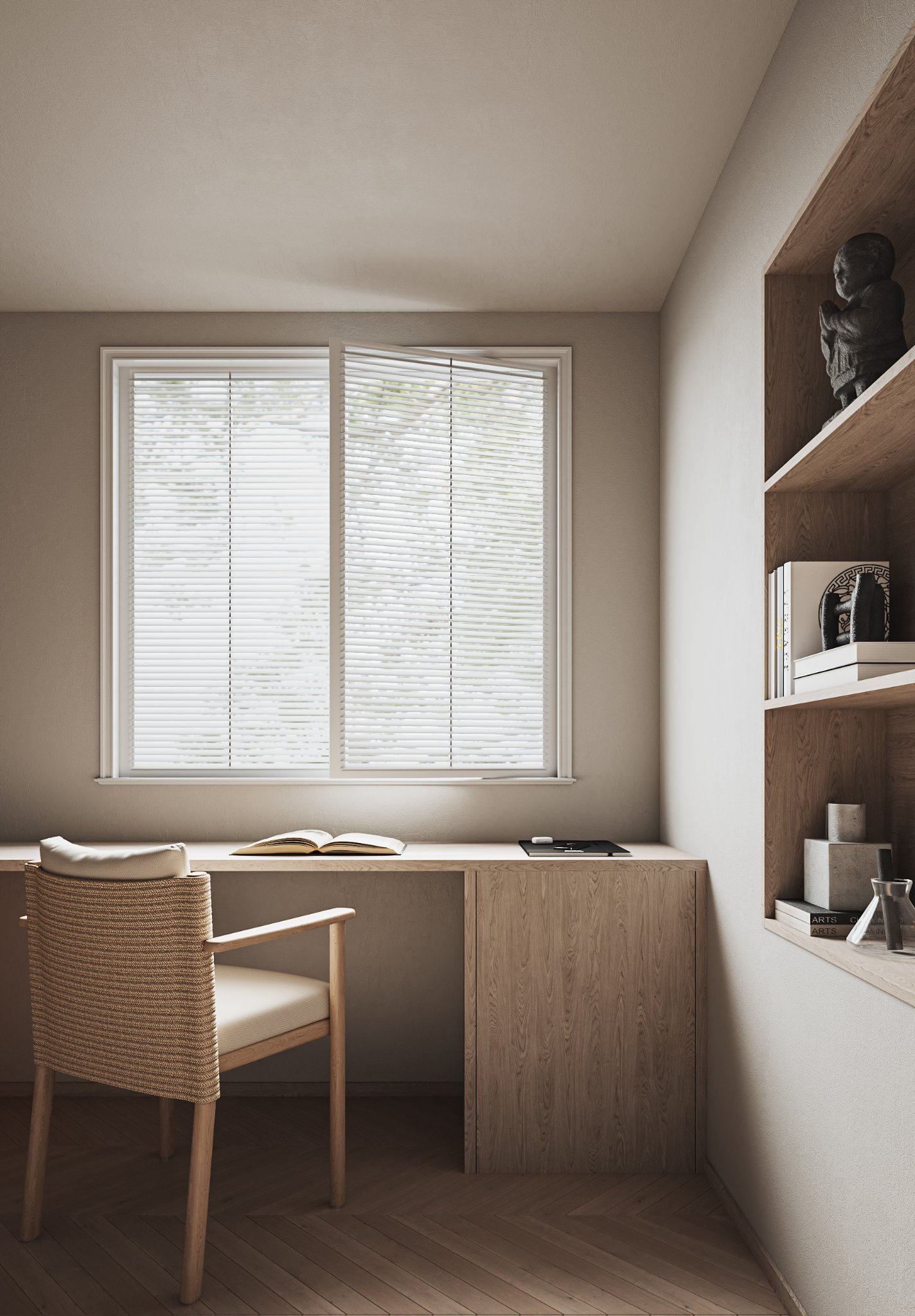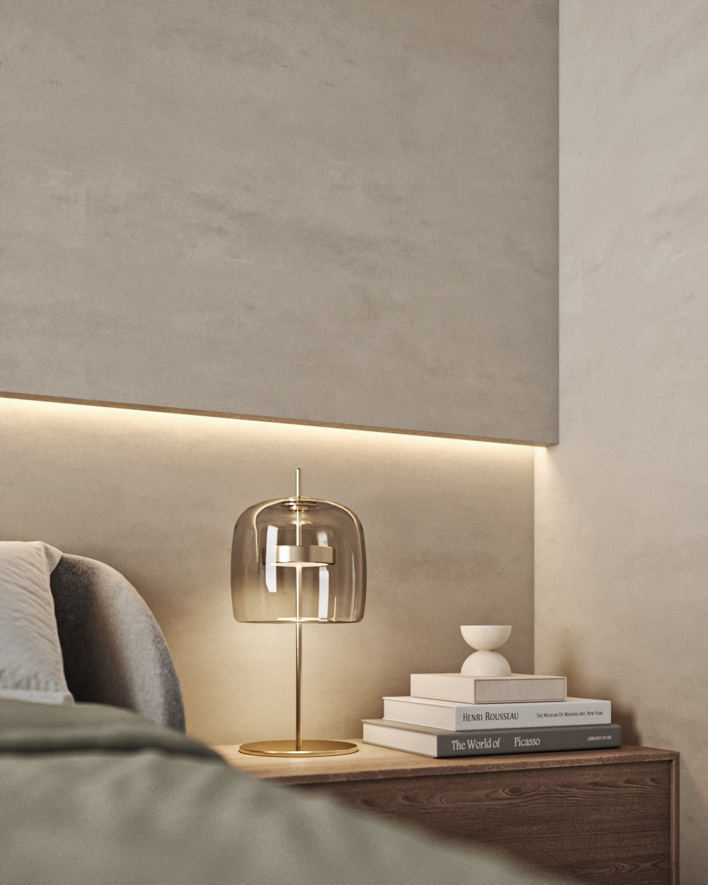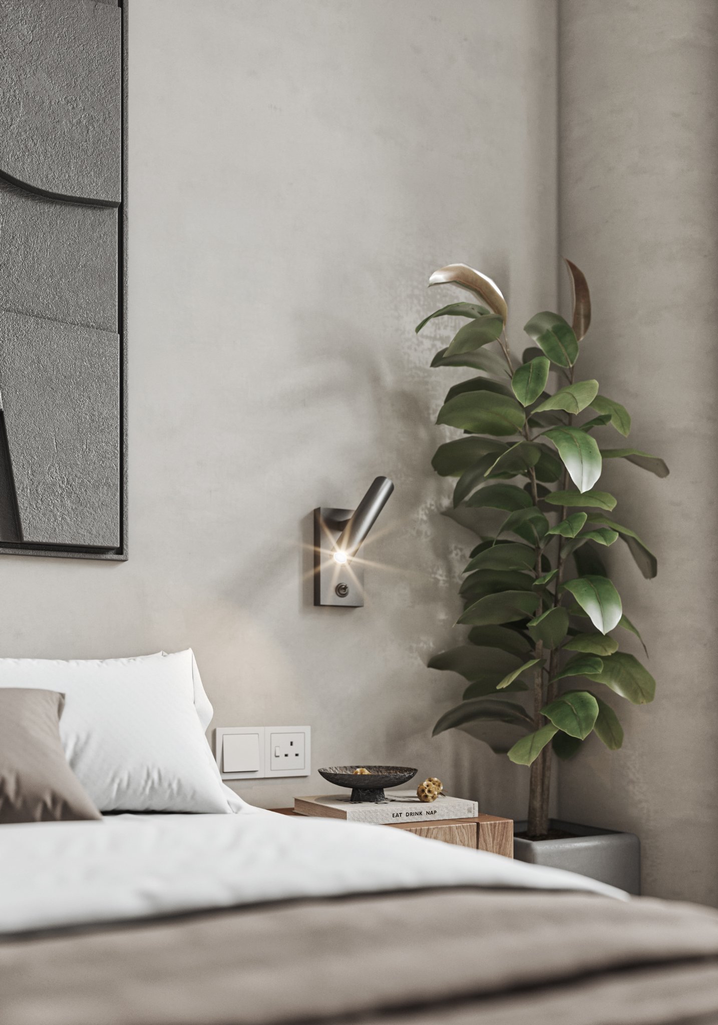 This interior design celebrates the beauty of minimalism, featuring microcement walls that provide a sleek, textured backdrop for the space. The clean, monochromatic palette of white and warm tones creates a serene and inviting atmosphere, while carefully chosen accents add depth and character. The ceiling becomes a focal point with its unique, sculptural lighting fixtures, which cast a soft, ambient glow and enhance the room’s modern aesthetic. Every element, from the streamlined furniture to the subtle textures, is thoughtfully curated to balance functionality and elegance. This space is a testament to the power of simplicity, where light, texture, and warmth come together to create a harmonious and sophisticated environment.